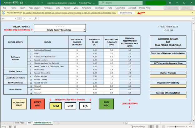 Although care has been taken to ensure the accuracy, completeness and reliability of the Water Demand Calculator (“Calculator”), neither IAPMO nor any other party makes any warranties, express or implied, or representations as to the accuracy of the Calculator. Neither IAPMO nor any other party assumes any liability or responsibility for any error or omissions in the information contained in or output by the Calculator. Neither IAPMO nor any other party assumes any responsibility for the consequences of use of such information, nor for any infringement of third party intellectual property rights which may result from its use.