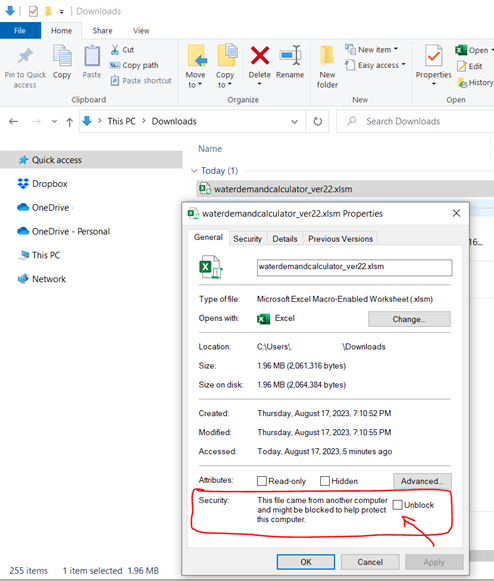 3. At the bottom of the General tab, select the Unblock checkbox and select OK.